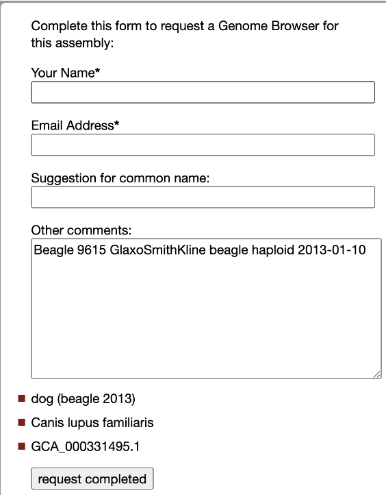If a desired assembly is not listed, you can request it by clicking "Unable to find a genome? Send us a request". This will direct you to the Genome Assembly Search and Request page.